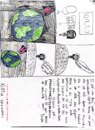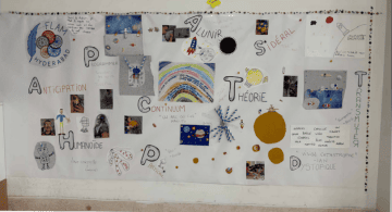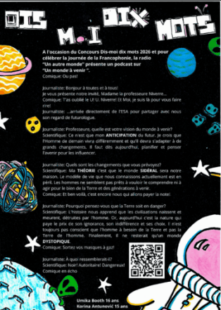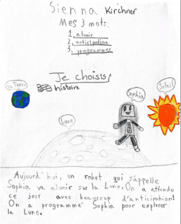 Les jeunes participants ont exploré dix mots liés au futur et à l’univers- alunir, anticipation, continuum, dystopique, humanoïde, particule, programmer, sidéral, théorie, transmuter– à travers des productions originales, sensibles et engagées. Les projets artistiques sont variés, et une grande diversité de matériaux a été utilisée, chez les petits comme chez les plus grands: collages, couture, dessins, peinture... sous forme de bandes dessinées, affiches, ou encore contes et nouvelles.