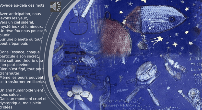 Descriptif: Ce projet, à la fois plastique et scientifique, s’inscrit dans une démarche riche et multidimensionnelle, mêlant habilement différents supports et matériaux tels que le papier, le métal, le coloriage et le collage. Il repose sur une forte dimension collective, où les approches artistique, poétique (notamment à travers les haïkus ) et scientifique s’entrelacent pour créer une œuvre cohérente et sensible. Un véritable travail sur les émotions est mené, permettant à chacun d’exprimer et de partager son ressenti. Les mots, soigneusement choisis et définis, révèlent une réelle efficacité dans leur capacité à transmettre des idées et des sensations. Le projet met également en lumière un focus clair sur l’altérité, invitant à reconnaître et comprendre l’autre dans sa singularité. Enfin, il se distingue par sa portée résolument positive, apparaissant comme porteur d’espoir et d’ouverture.