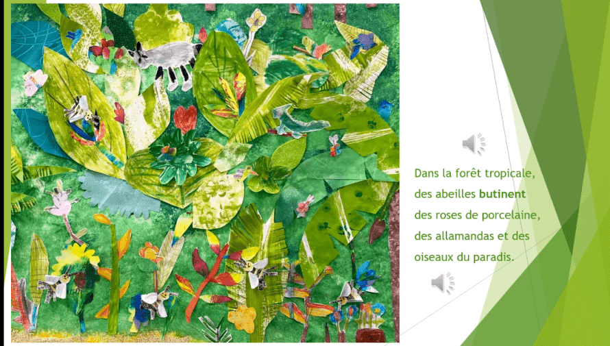 Descriptif : Chaque mot de l'édition est clamé et il est ensuite accompagné d'un texte, le support utilisé est un diaporama audiovisuel très travaillé. Les élèves utilisent un vocabulaire endémique de leur région. Très belle réalisation plastique avec des collages, de la peinture, du sable, des bruitages sont utilisés pour rendre plus vivant le texte. Les abeilles se désolent de la pollution des touristes car le vivant est détruit. Les abeilles aspirent à une planète plus respectée, la péroraison est intéressante et musicale « la planète est trop belle pour venue une poubelle ».